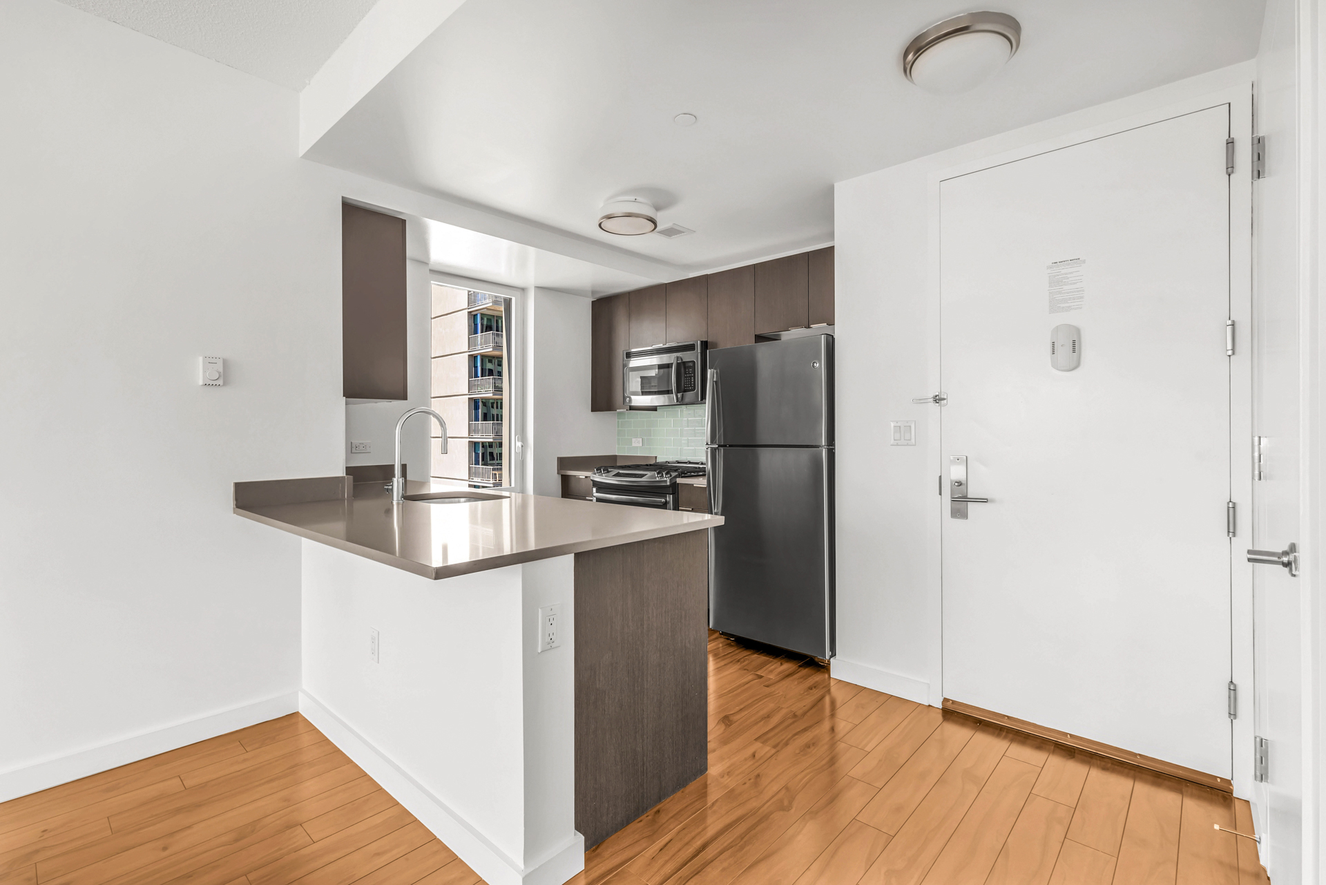 Unit kitchen, stainless steel appliances, hardwood floors, window in kitchen, green subway tile between cabinetry and countertop, entry door adjacent to kitchen, breakfast nook attached to kitchen countertop, dark brown wooden cabinetry, white walls.